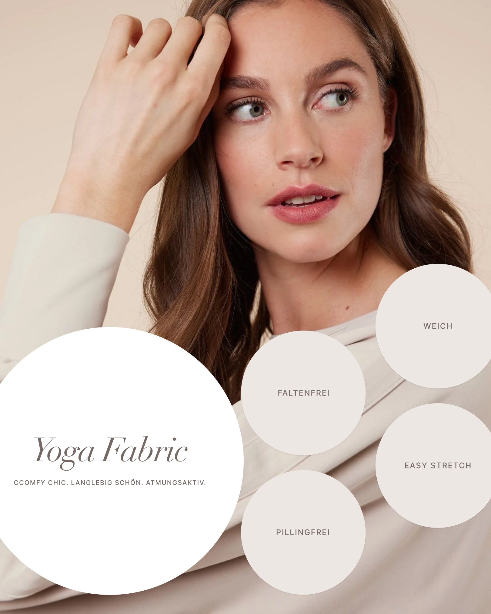 Yogastoffe sind pflegeleicht, da sie knitterfrei sind und nicht gebügelt werden müssen. Der Stoff ist außerdem frei von Pilling und bleibt lange schön. Das macht die Artikel auch im Gebrauch langlebig. Der Yoga-Stoff bietet viel Bewegungsfreiheit durch den hohen Anteil an Elastan in Kombination mit Polyamid. Der weiche, geschmeidige Stoff fällt schön am Körper entlang. Daher kann der Yogastoff problemlos in verschiedenen Modellen und Passformen verwendet werden. In der Capsule Collection finden Sie mehrere Artikel aus Yogastoff, die Sie am Yoga-Stempel erkennen können!