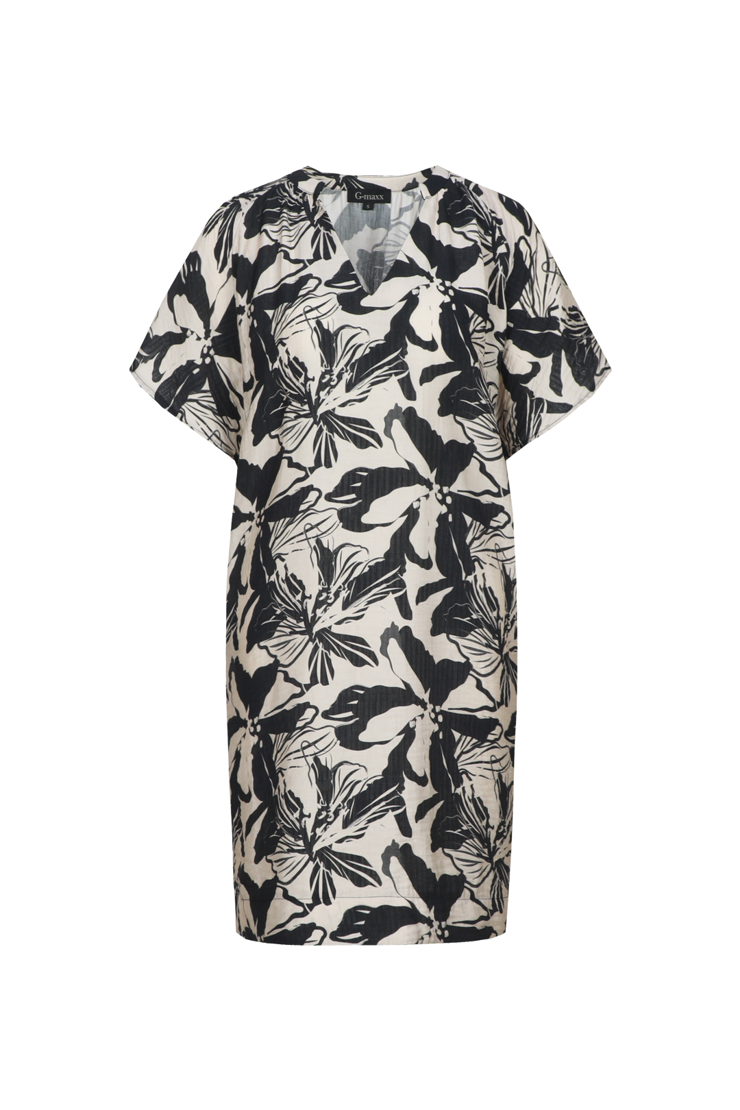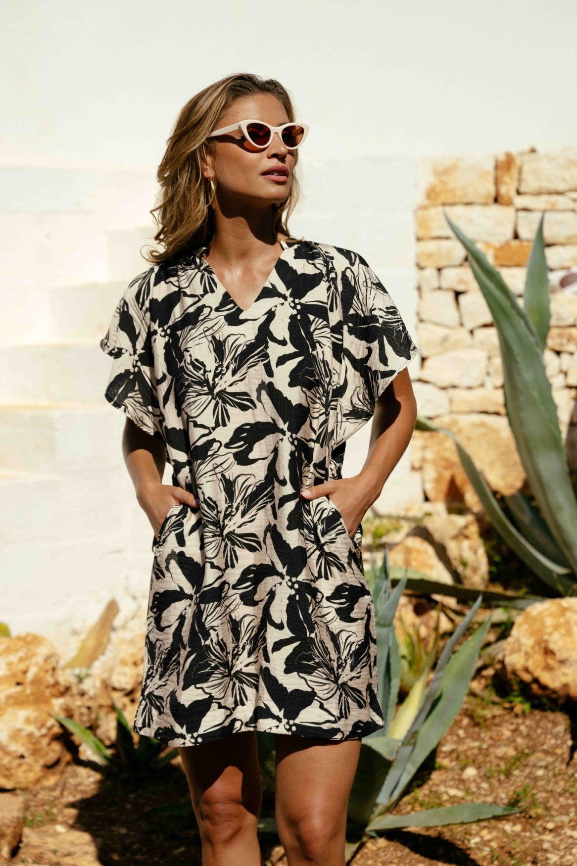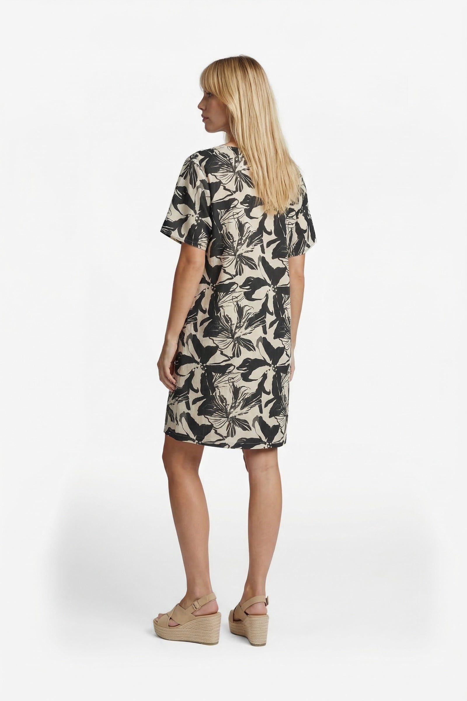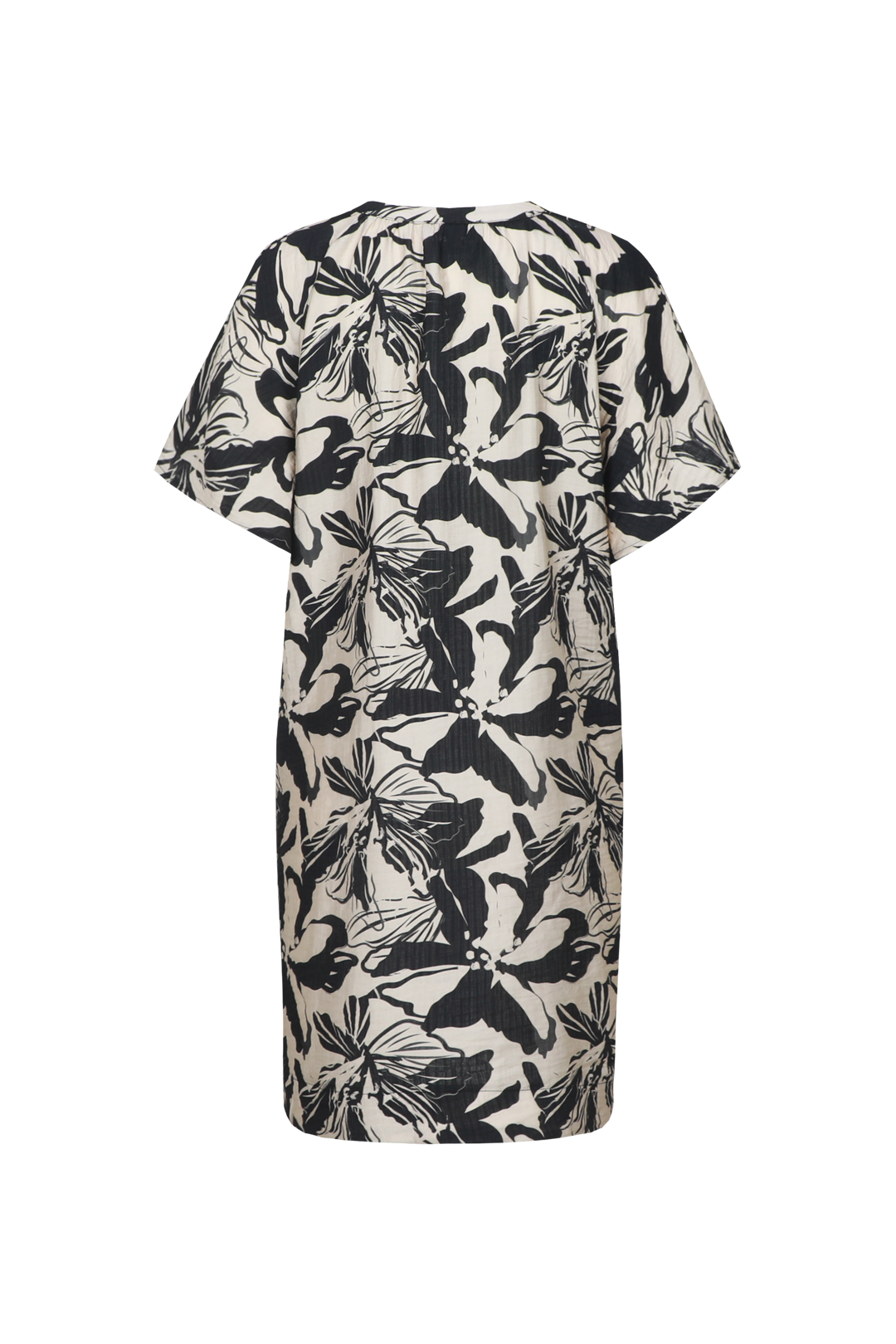 Das Oline-Kleid hat eine gerade, locker sitzende Passform, die einen entspannten und mühelosen Look schafft. Der V-Ausschnitt und die kurzen Ärmel verleihen dem Modell einen luftigen und tragbaren Charakter. Der kontrastierende Allover-Print sorgt für einen starken und modernen Effekt, der das Kleid sofort auffällig macht. Der leichte Stoff ist angenehm zu tragen und macht es zur idealen Wahl für warme Tage.