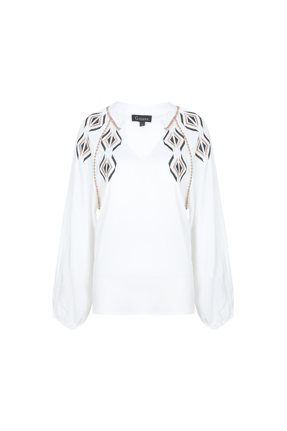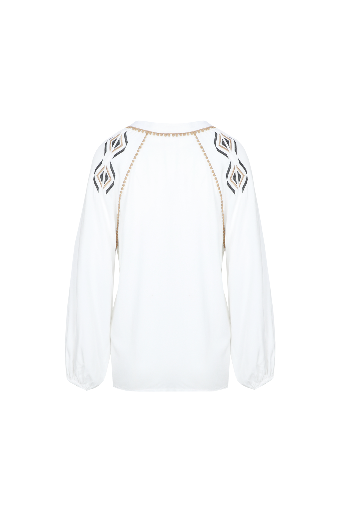 Das Xylia-Top ist eine elegante Bluse mit raffinierten Schulterdetails. Sie hat eine gerade, lockere Passform und einen V-Ausschnitt mit dezentem Kragen. Die langen Ärmel fallen weich und sind mit schmalen Bündchen versehen. Die Stickereien und die elegante Borte entlang der Schulterlinie verleihen dem Top einen einzigartigen und femininen Look. Kombinieren Sie es mit einer leichten Hose oder Jeans für einen stilvollen und charaktervollen Auftritt.