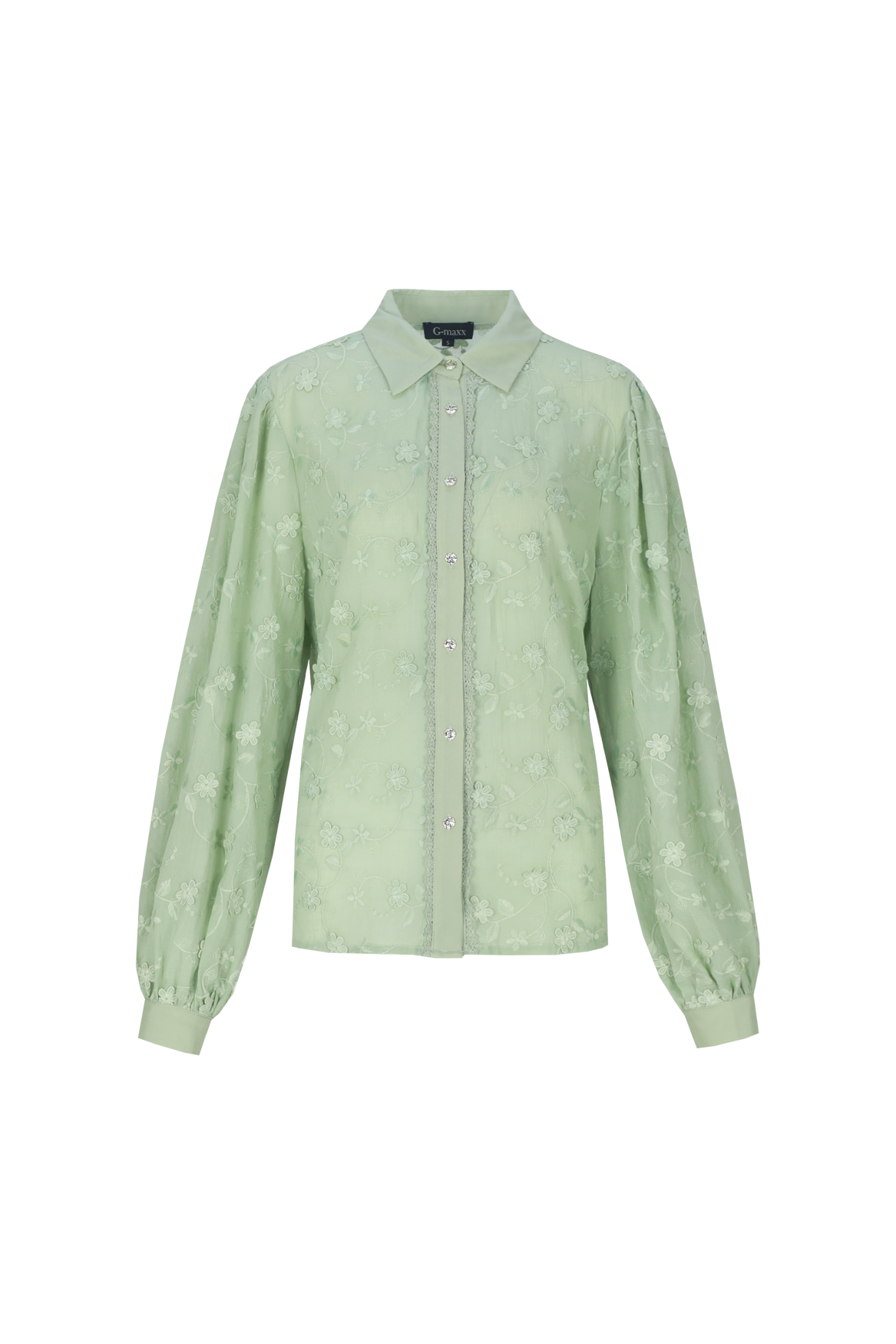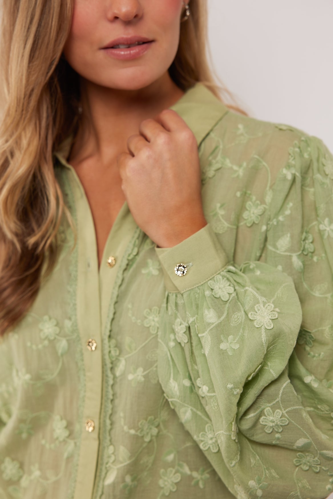 The Julieta blouse exudes refinement and femininity thanks to its sheer fabric with a richly embroidered floral pattern, giving it a luxurious look. The classic collar and button closure create a timeless silhouette, while the subtle details and soft volume of the sleeves create an elegant balance between romantic and modern. This blouse drapes smoothly and feels light and comfortable, allowing it to move effortlessly throughout the day. A stylish piece that can be worn both casually and formally, adding an elegant finishing touch to any look.