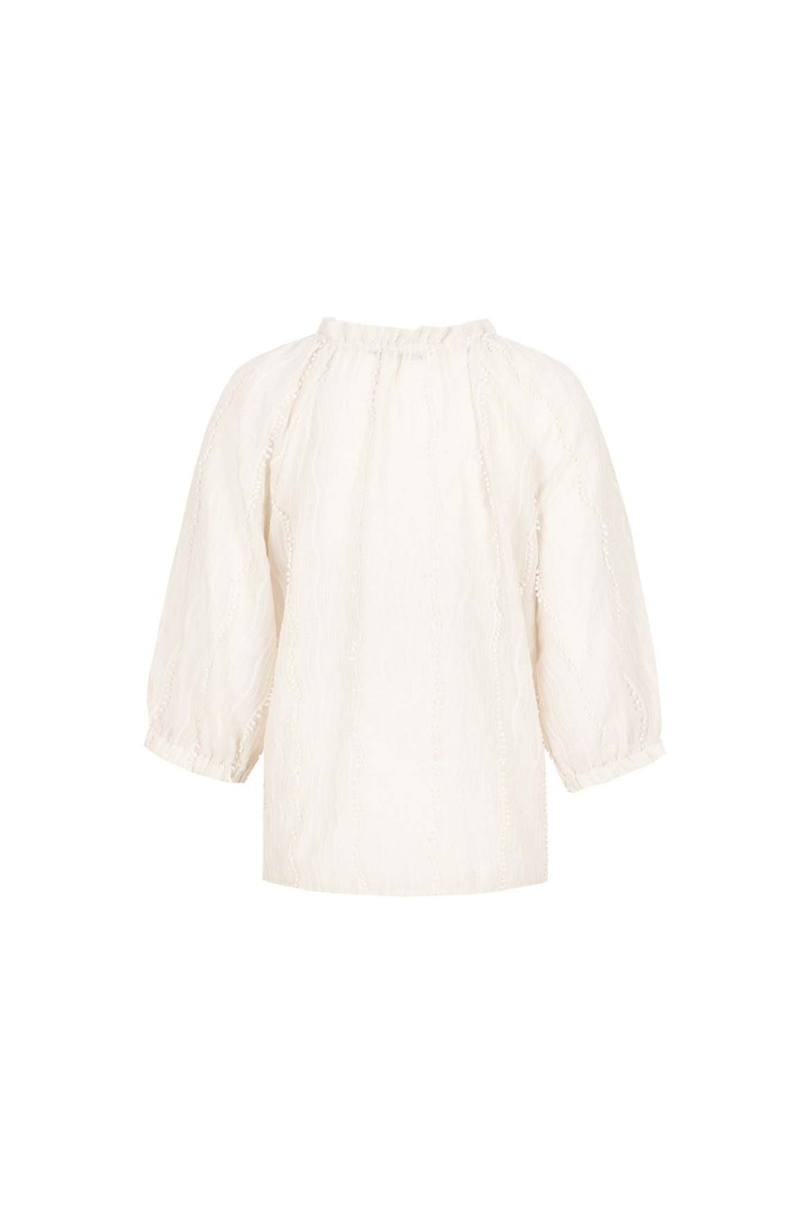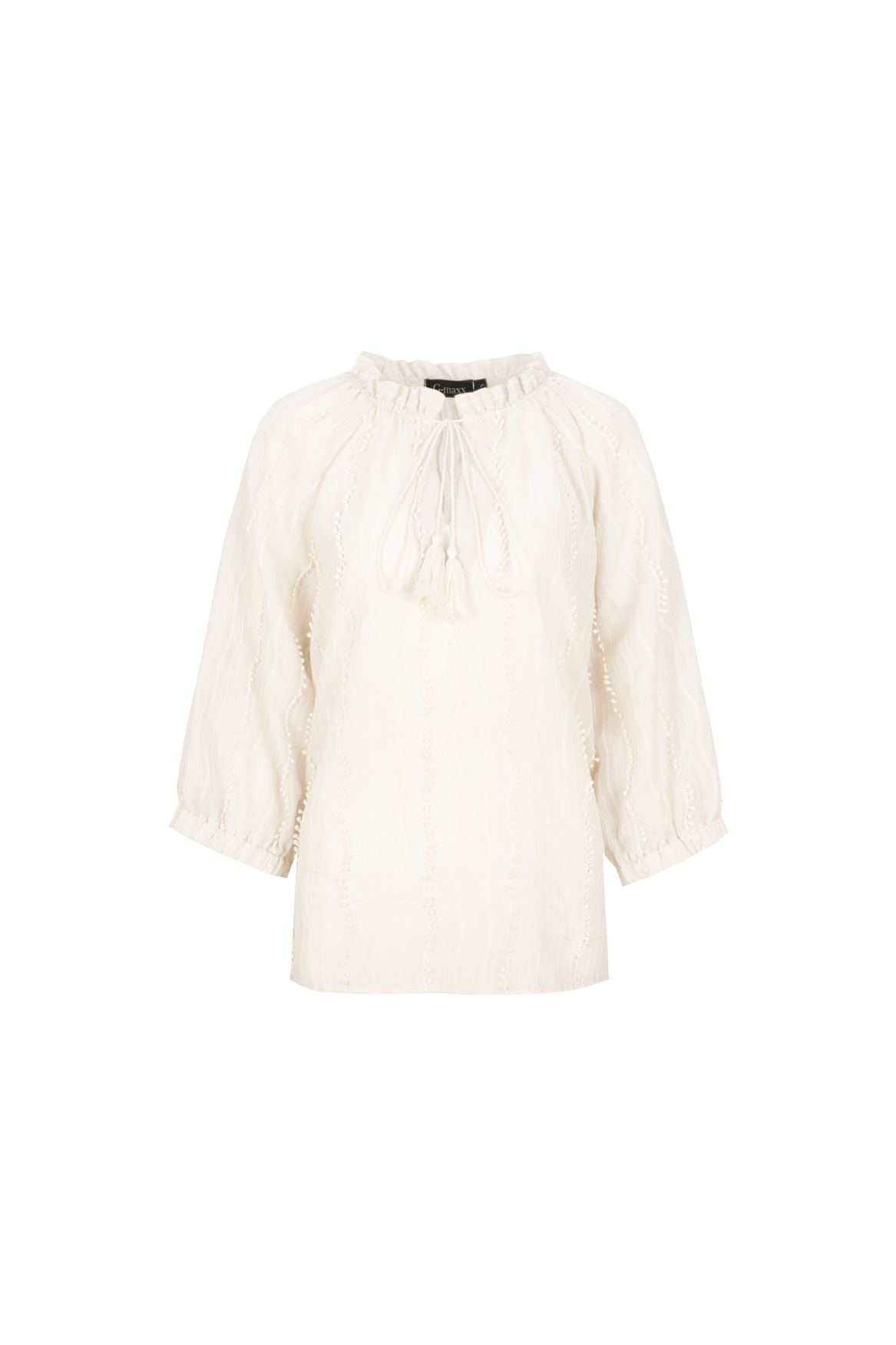 The Meliora blouse is a light, feminine top with refined details. It has a loose fit with a subtle V-neck and tasseled ties. The three-quarter sleeves with elasticated cuffs give the blouse a soft, voluminous look. The fabric is enriched with a fine texture and subtle structure, adding depth to the design. Wear the blouse casually with jeans for a casual look or pair it with trousers for a more formal look.