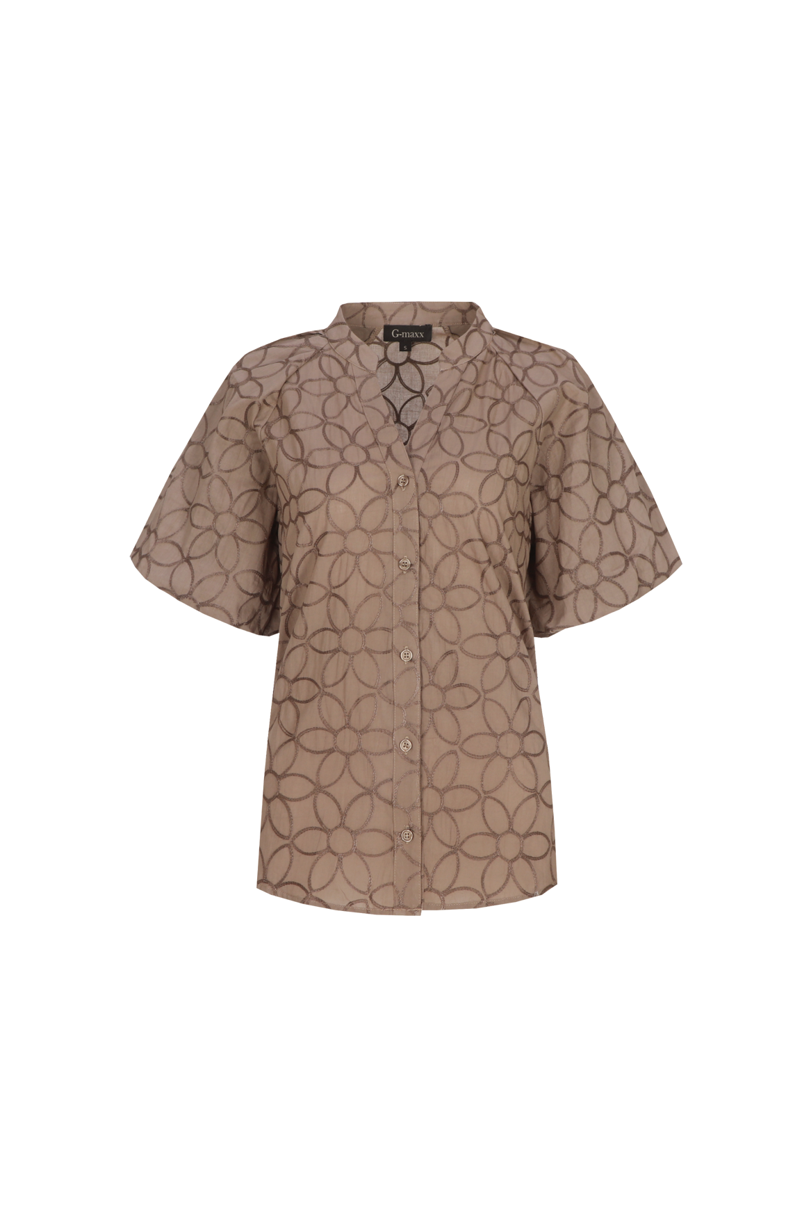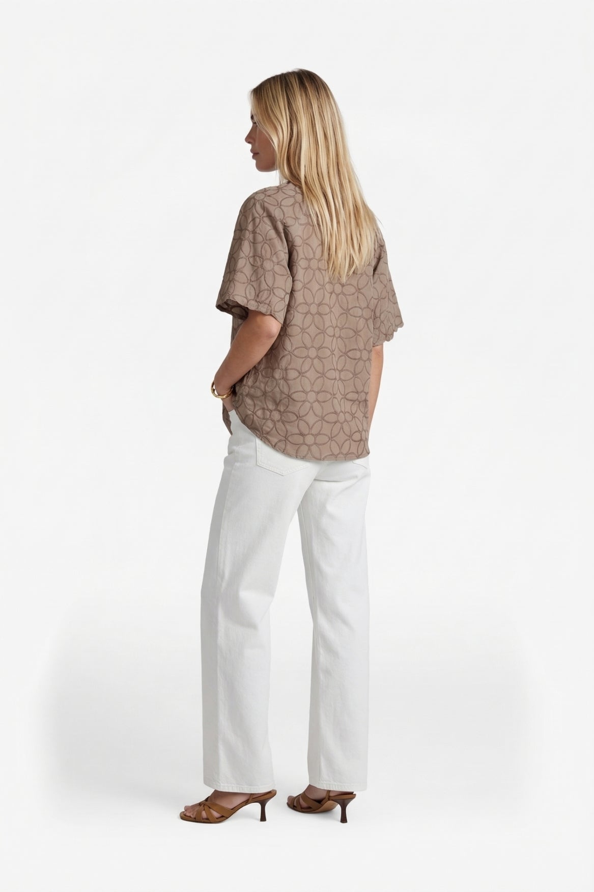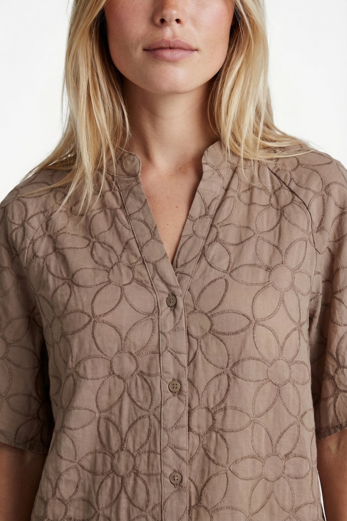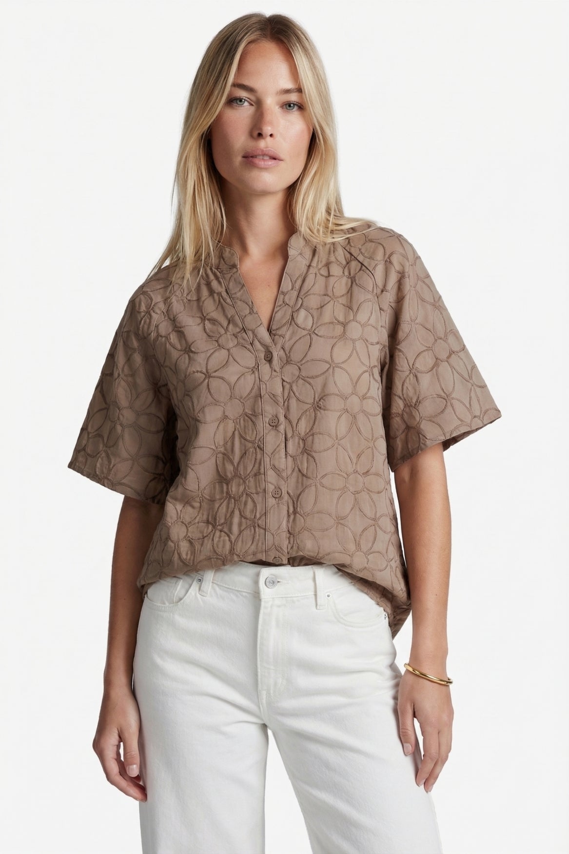 The Thalia blouse is a refined addition to your wardrobe with an elegant, feminine look. It features a slightly loose fit, a subtle V-neck with a button closure, and wide, short sleeves for an airy silhouette. The tonal floral print in the fabric gives the blouse a soft, luxurious touch. Pair it beautifully with denim for a fresh, casual look or with a skirt or trousers for a more formal look.