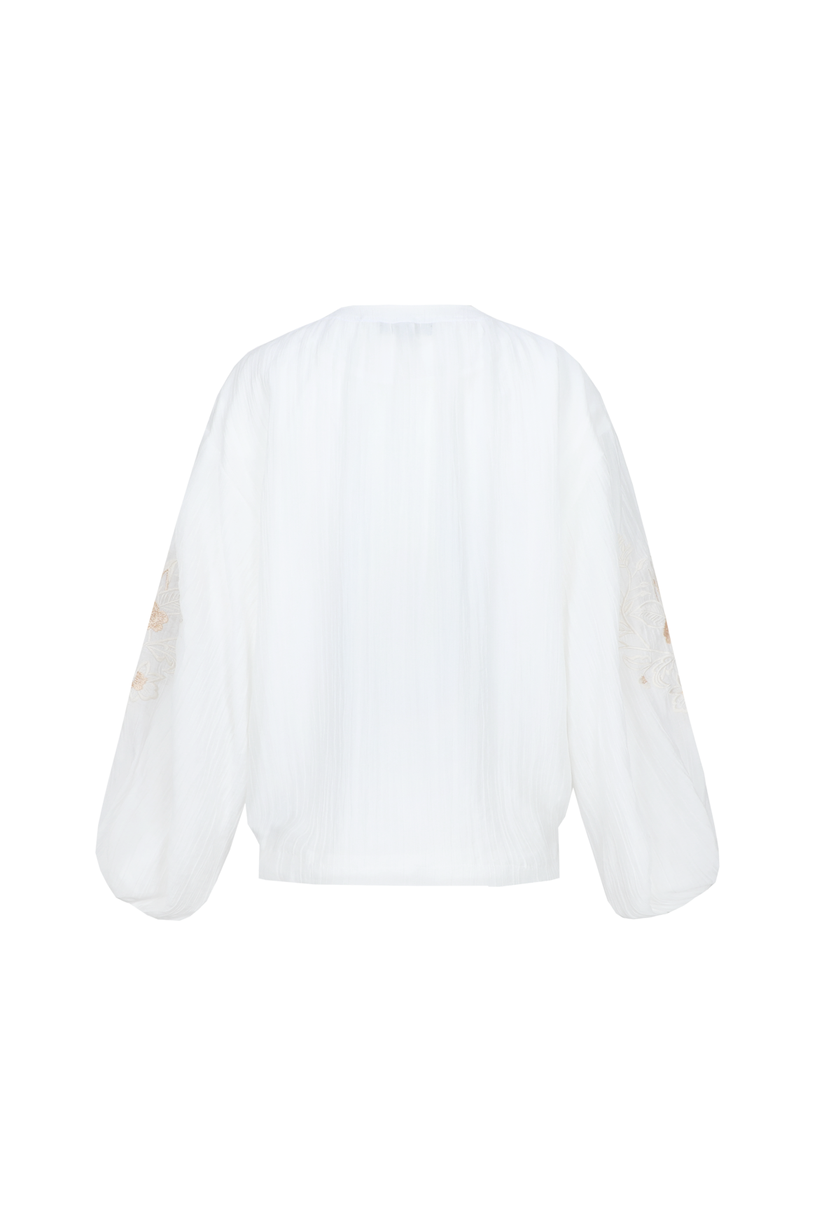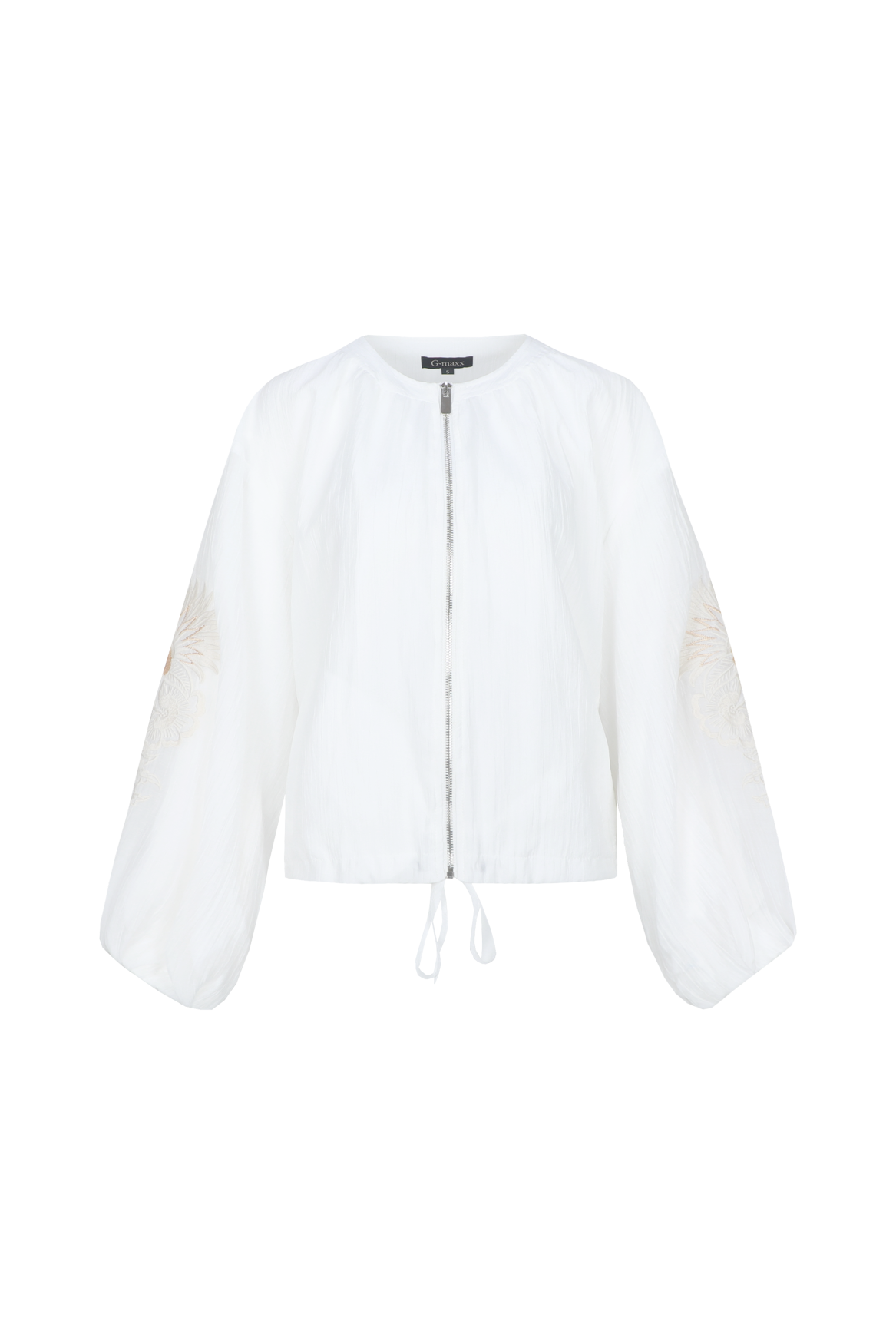 The Zaira jacket is a refined piece with an airy and feminine look. It features a round neckline, a front zipper, and voluminous sleeves with subtle embroidery for an elegant touch. The lightweight, flowing fabric gives the jacket a soft and comfortable feel. Perfect for adding a touch of elegance to any outfit, whether worn casually or chicly.