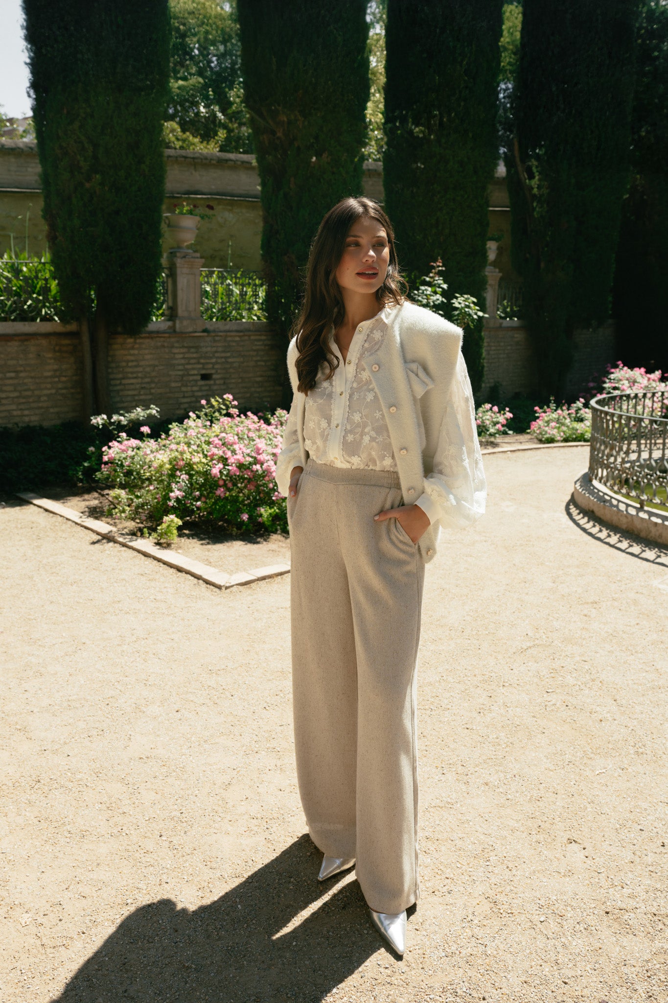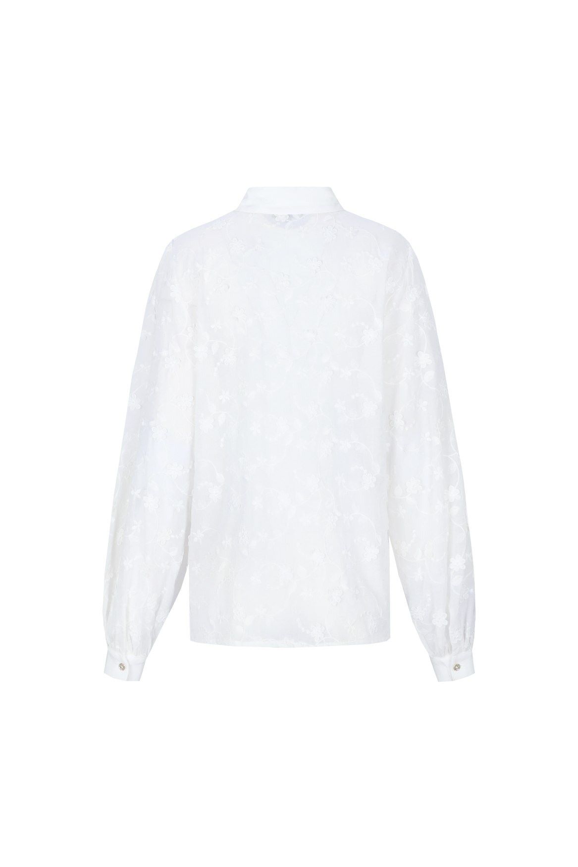 The Julieta blouse exudes refinement and femininity thanks to its sheer fabric with a richly embroidered floral pattern, giving it a luxurious look. The classic collar and button closure create a timeless silhouette, while the subtle details and soft volume of the sleeves create an elegant balance between romantic and modern. This blouse drapes smoothly and feels light and comfortable, allowing it to move effortlessly throughout the day. A stylish piece that can be worn both casually and formally, adding an elegant finishing touch to any look.