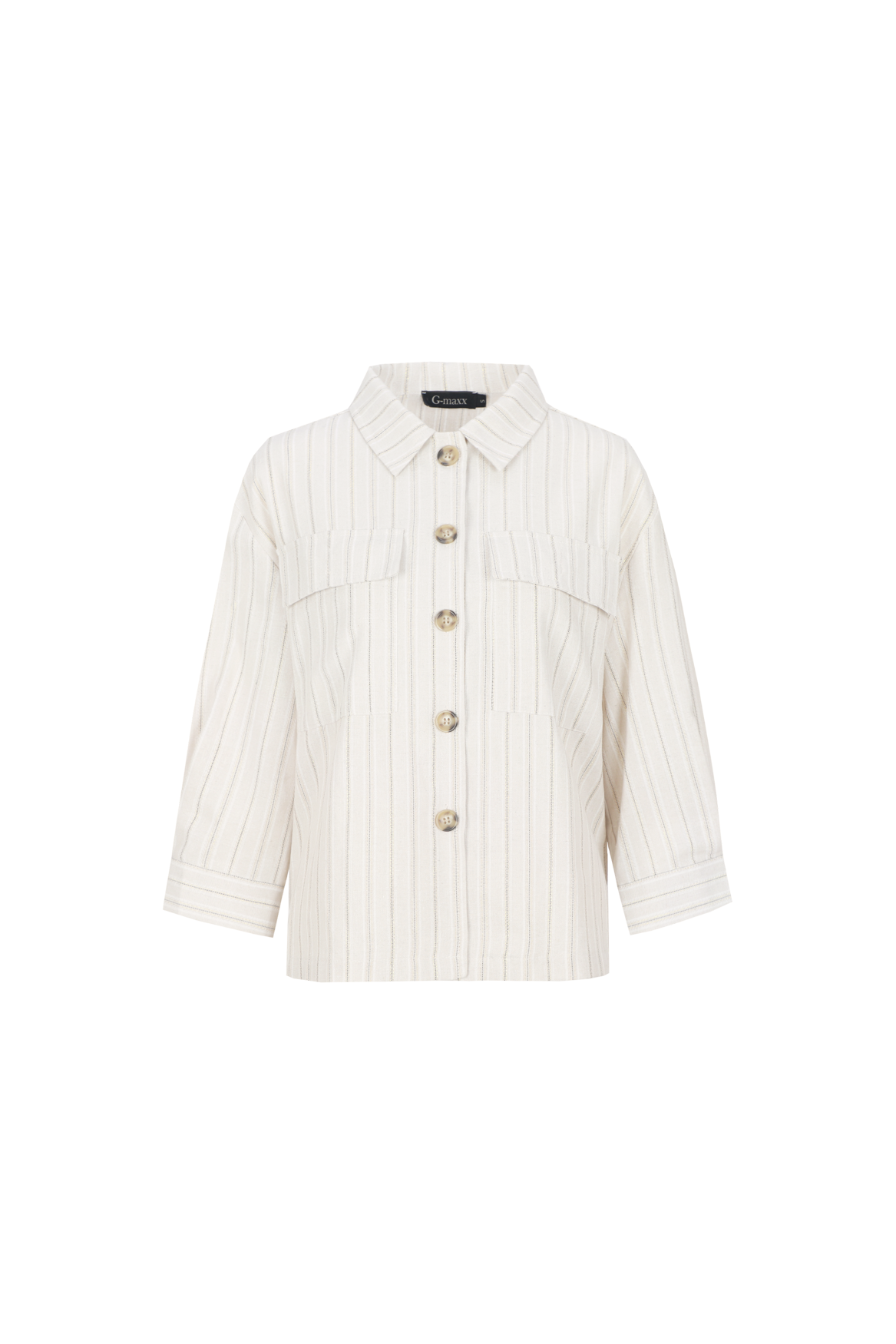 The Bellamy blouse is a stylish essential with a modern, casual look. It has a straight, slightly boxy fit with a classic collar and large patch chest pockets. The button closure with striking buttons gives the design a bold touch. The three-quarter sleeves with a wrap detail create a casual look. Wear the blouse closed as a top or open over a basic for a layered ensemble.