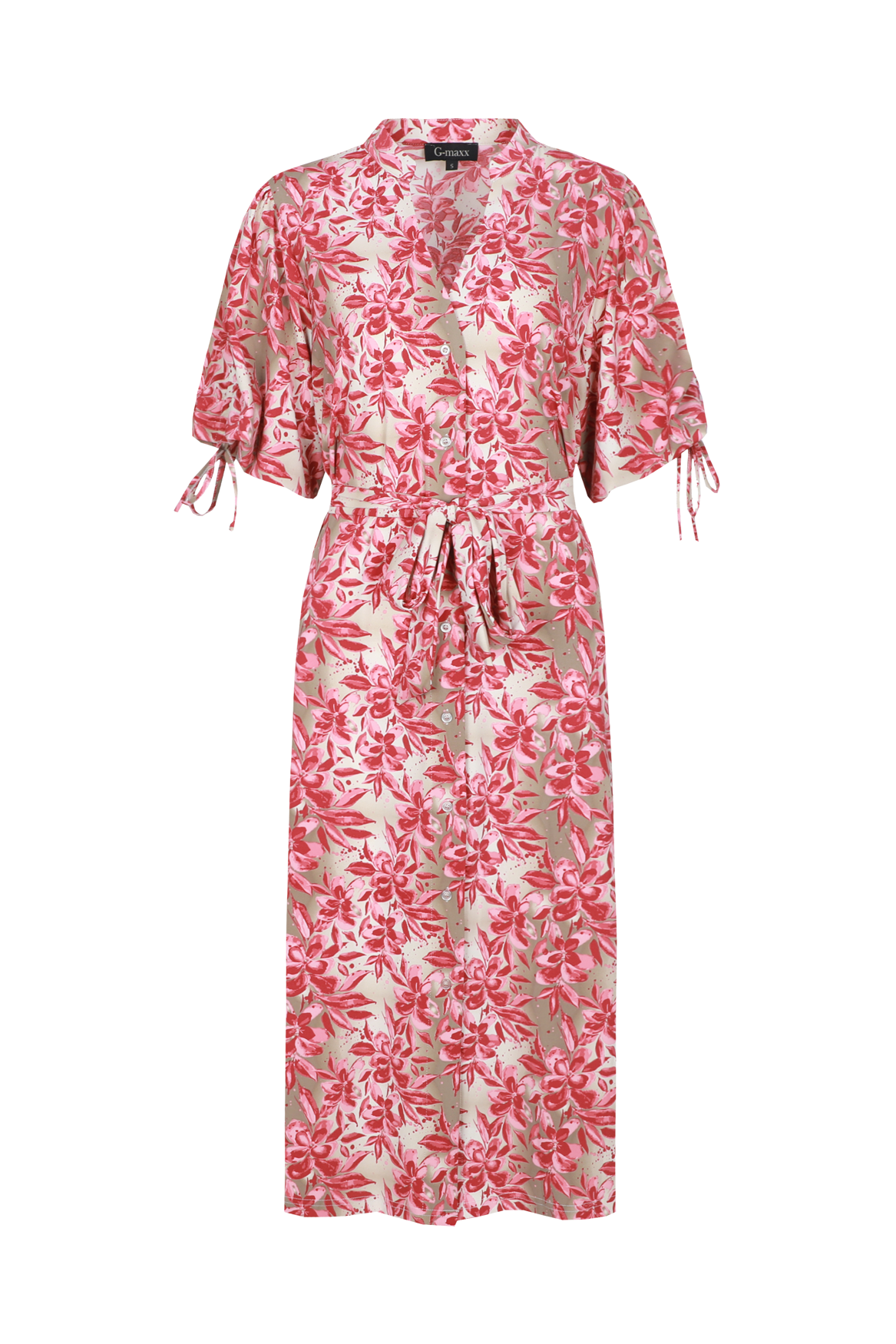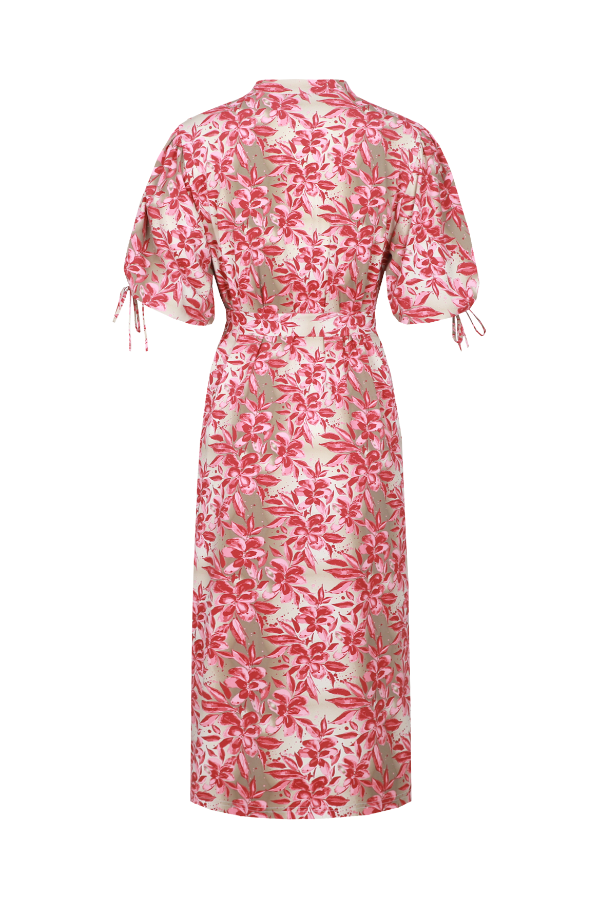 The Evania dress is a feminine midi dress with a refined all-over print. It features a V-neck with a button closure and mid-length sleeves with a subtle tie detail for a playful touch. The matching belt beautifully accentuates the waist, creating an elegant silhouette. The flowing fabric and midi length make this dress perfect for both a summer day and a stylish occasion.