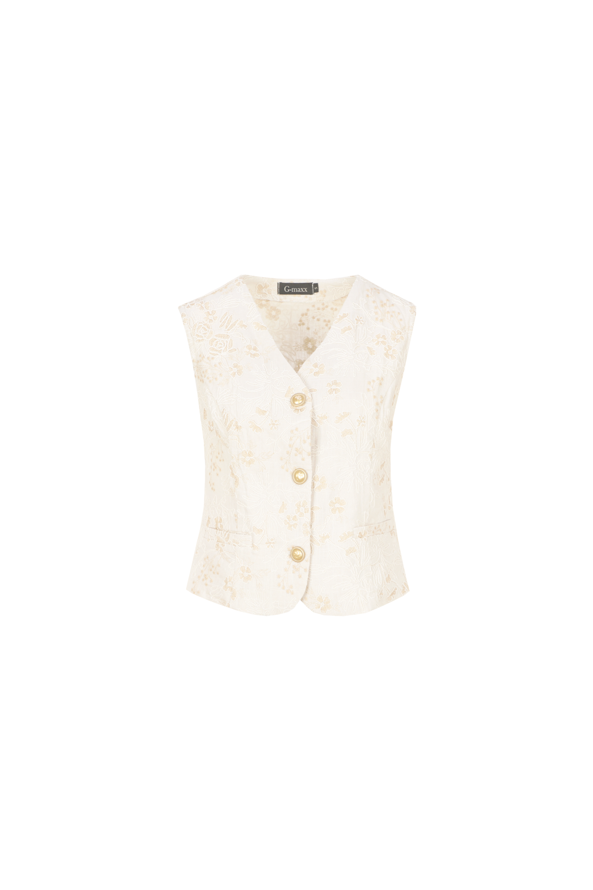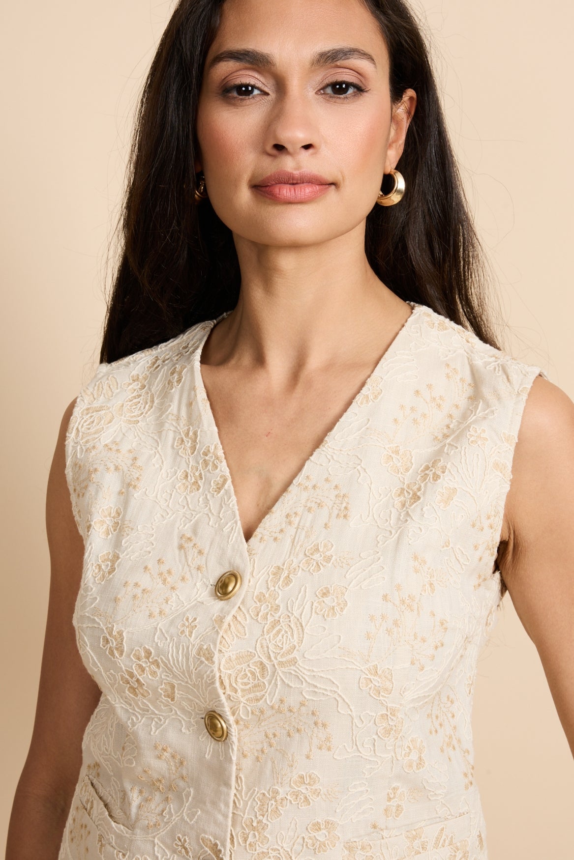 The Ivara vest is an elegant addition to your wardrobe with a refined, feminine look. The sleeveless style has a slim fit and a V-neck with a button closure. The gold-tone buttons add a luxurious touch. The subtle floral texture in the fabric creates a rich and romantic look. Wear the vest as a set with the matching trousers or pair it with a blouse or top for a sophisticated look.