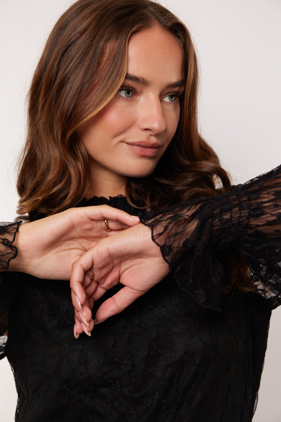 The Jin top is a refined must-have with a romantic touch. The subtle lace texture and playful details at the neck and sleeves give your look an elegant touch. Pair this top easily with a skirt or trousers for a stylish outfit, whether casual or chic.