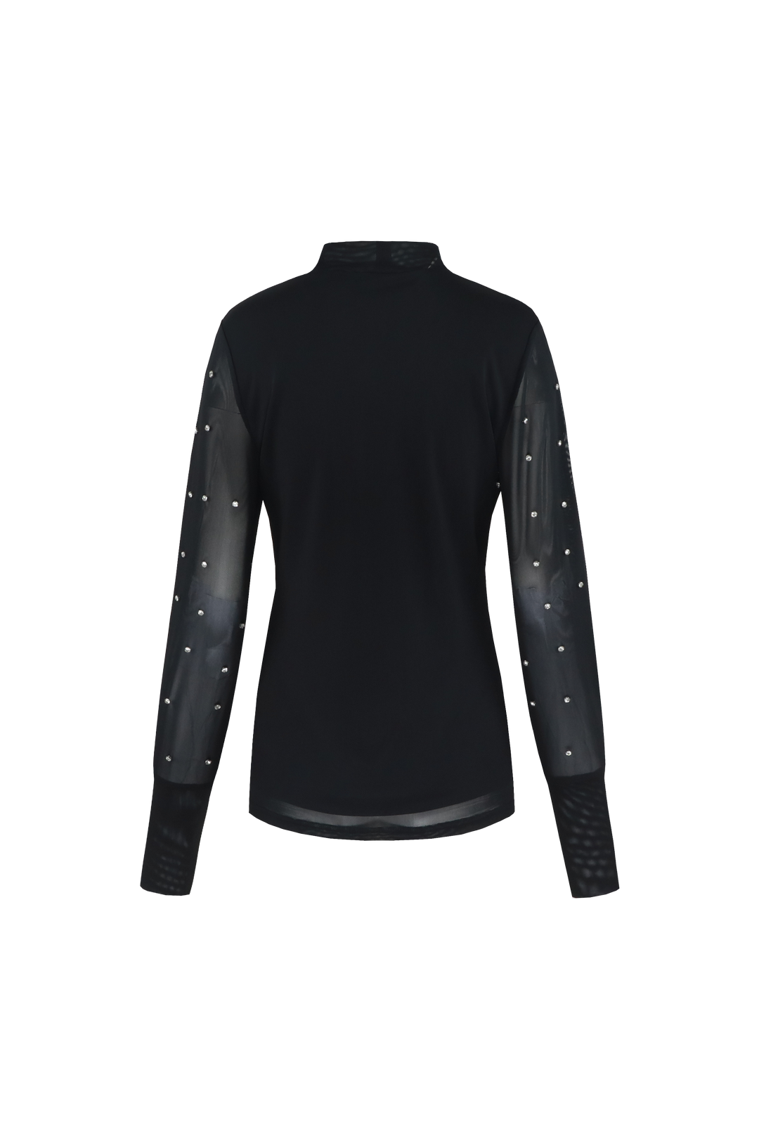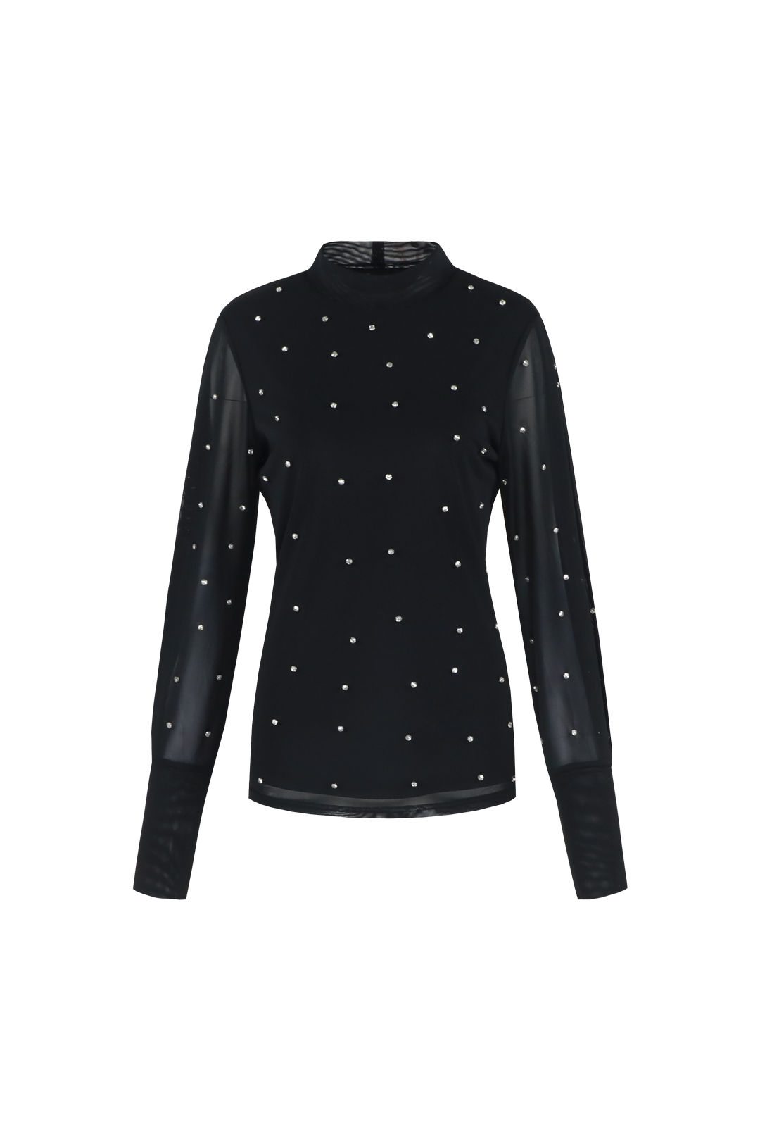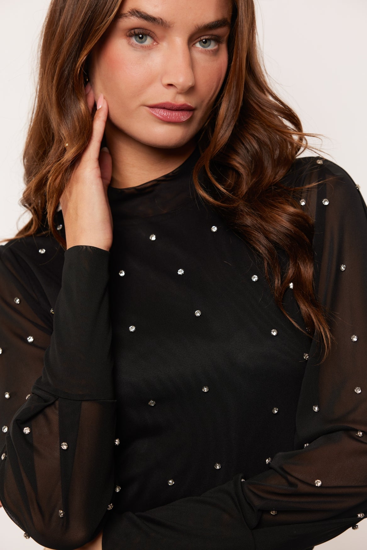 The Veda top exudes elegance and glamour. The sheer mesh fabric is adorned with subtle pearl details, creating a chic and festive look. Perfect for pairing with a skirt or trousers for a stylish evening outfit.