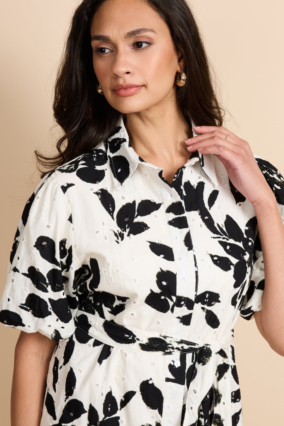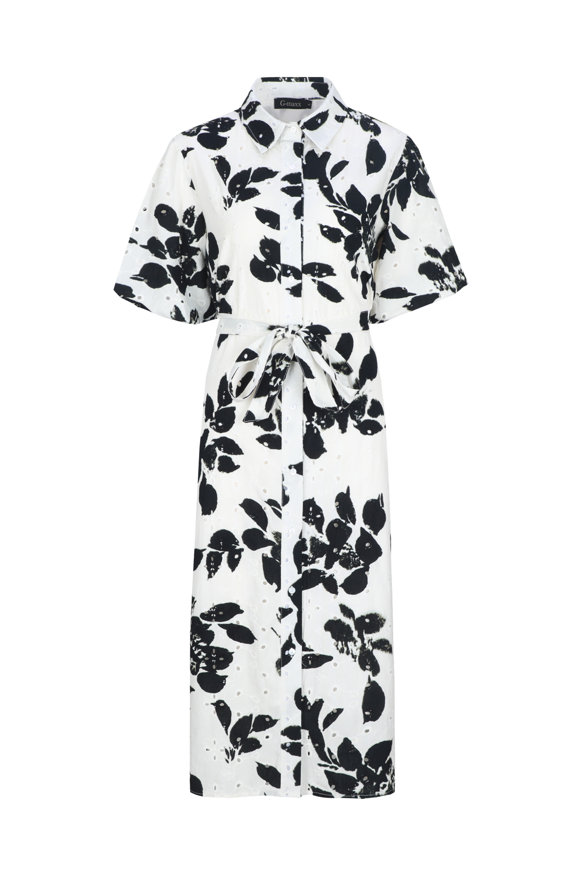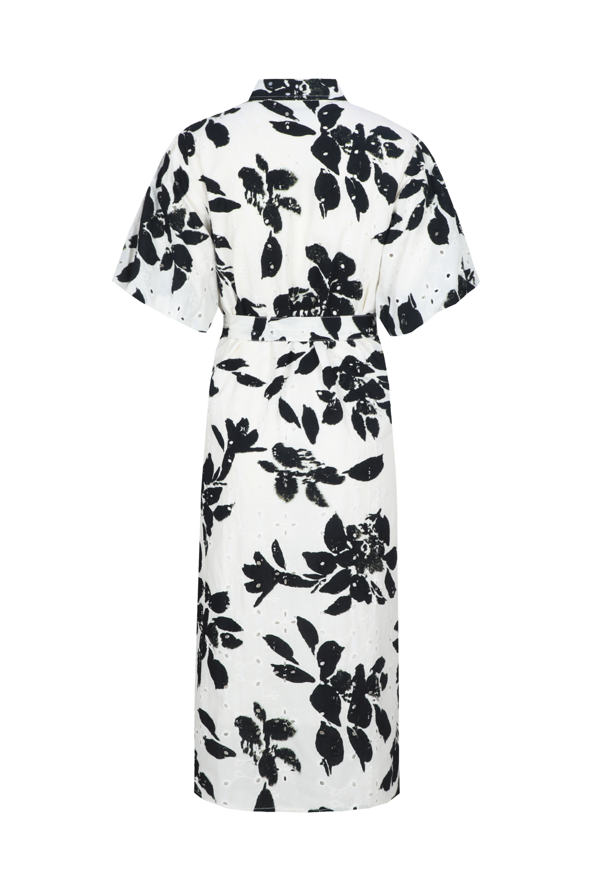 The Zophia dress is an elegant midi dress with a powerful look. It has a straight, slightly loose fit with a classic collar, button closure, and short, flowing sleeves. The tie belt at the waist creates a feminine silhouette and can be adjusted to your liking. The all-over floral print in contrasting colors gives the dress a modern touch, while the subtle texture of the fabric adds depth. Wear the dress with heels for a dressy look or pair it with sandals for a more casual look.