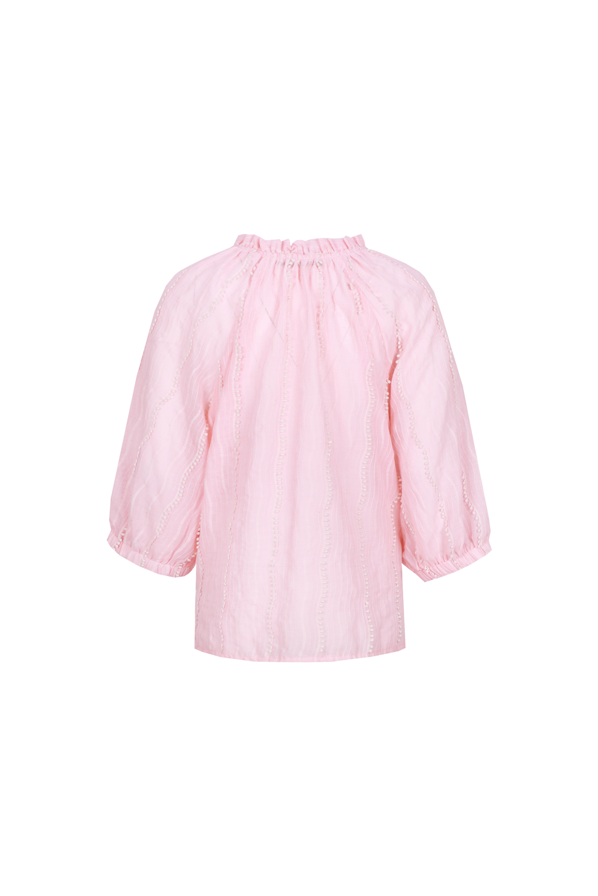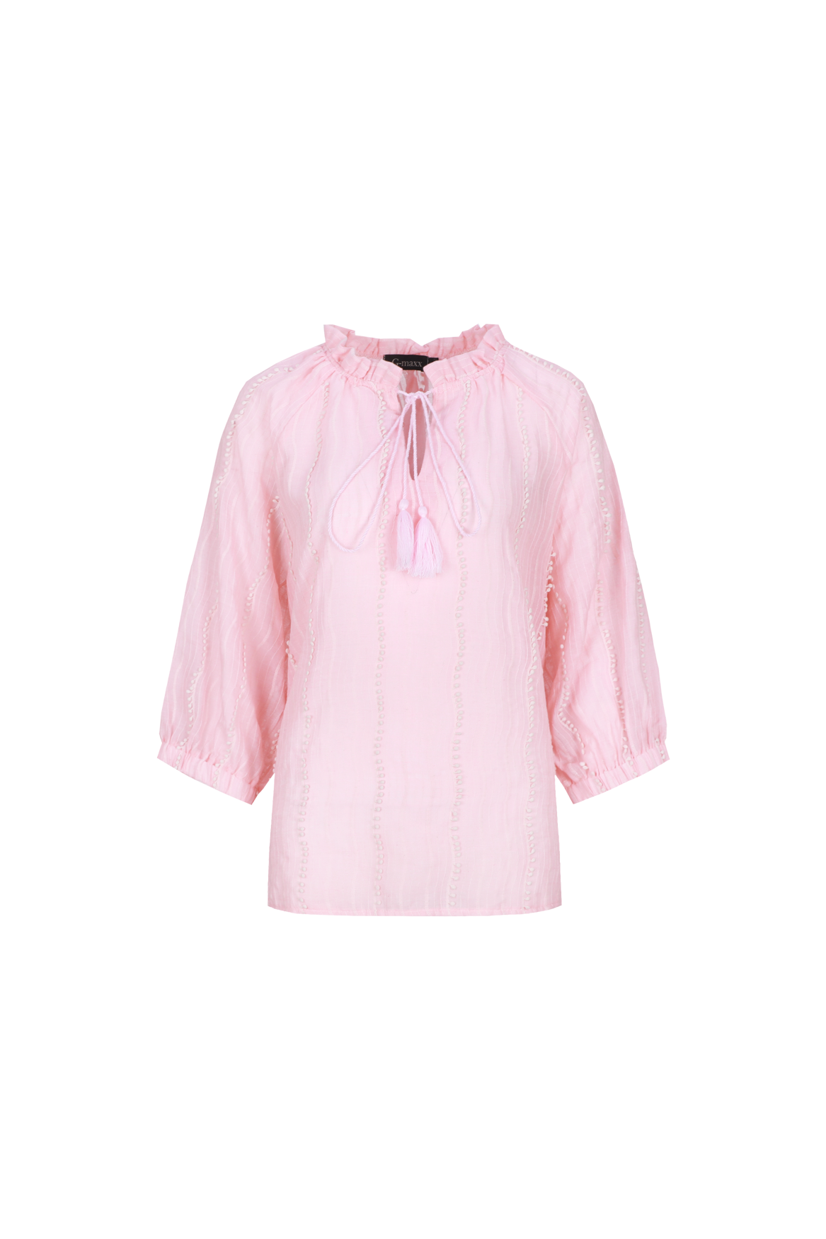 De Meliora blouse is een luchtige, vrouwelijke top met verfijnde details. Het model heeft een losvallende pasvorm met een subtiele V-hals en striklinten met kwastjes. De driekwartmouwen met elastische boord geven de blouse een zachte, volumineuze uitstraling. De stof is verrijkt met een fijn reliëf en subtiele structuur, wat zorgt voor extra diepte in het ontwerp. Draag de blouse nonchalant op een jeans voor een casual look of combineer met een nette broek voor een meer geklede styling.