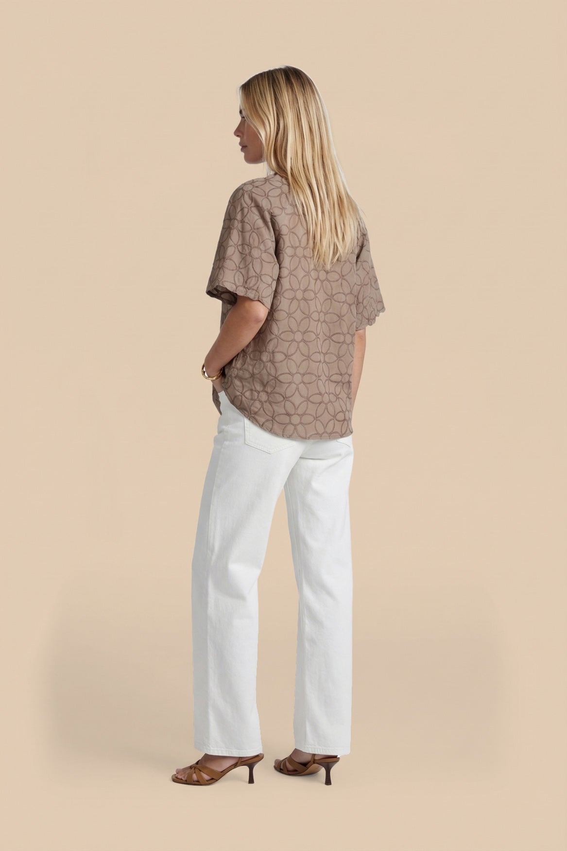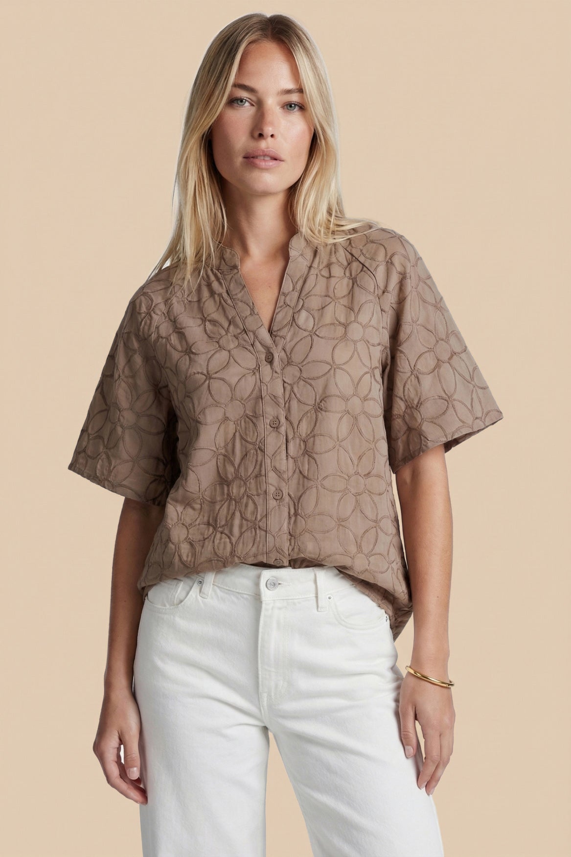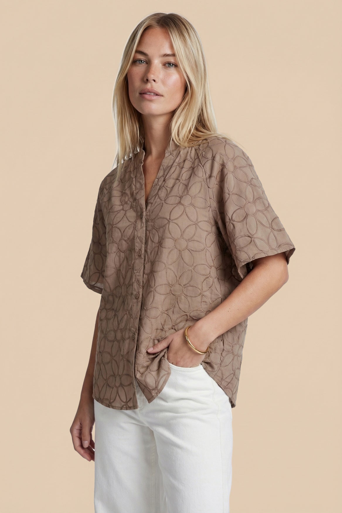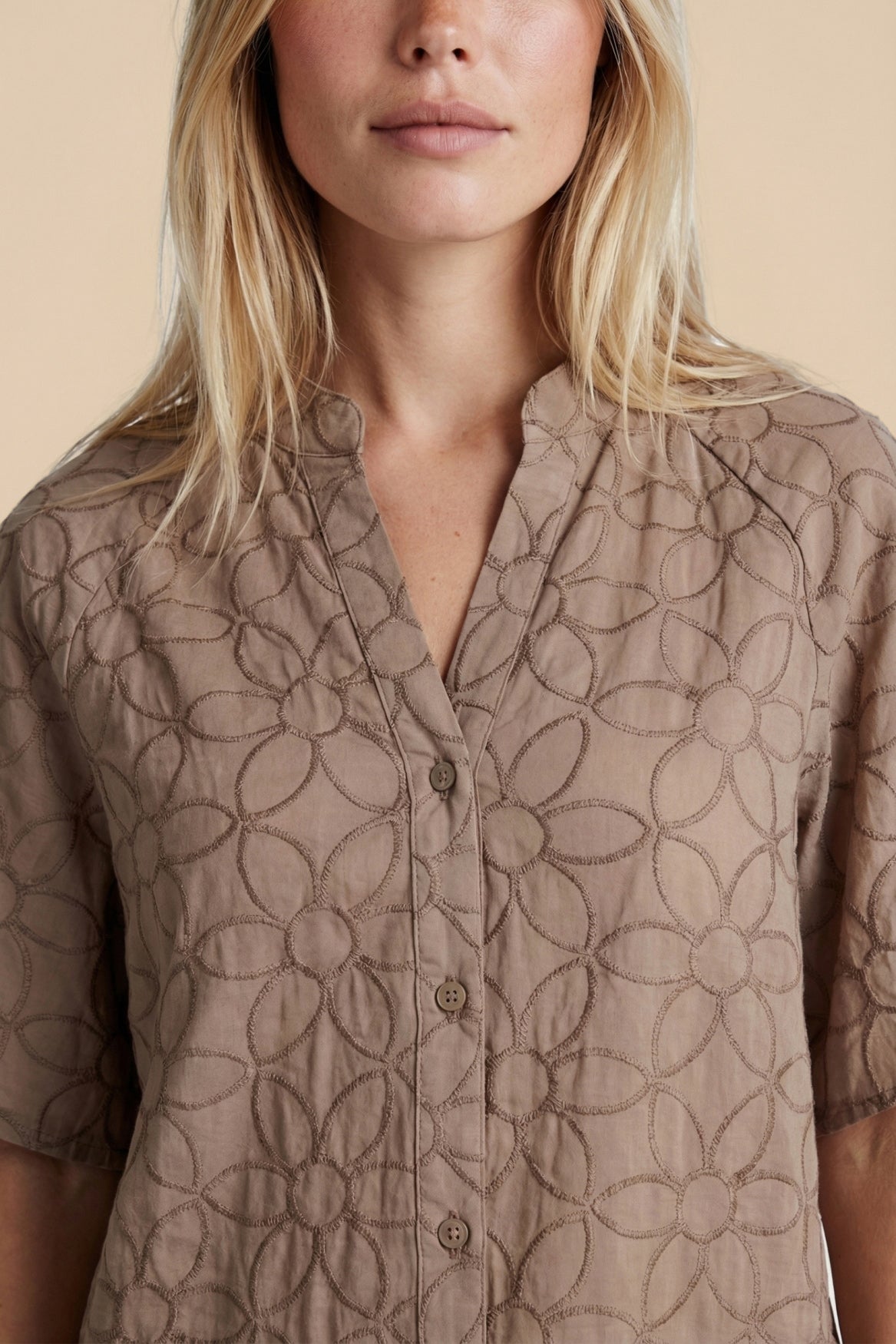 De Thalia blouse is een verfijnde toevoeging aan je garderobe met een elegante, vrouwelijke uitstraling. Het model heeft een licht losvallende pasvorm, een subtiele V-hals met knoopsluiting en wijde, korte mouwen die zorgen voor een luchtig silhouet. Het ton-sur-ton bloemendessin in de stof geeft de blouse een zachte, luxe touch. Mooi te combineren met denim voor een frisse, casual look of met een rok of pantalon voor een meer geklede uitstraling.